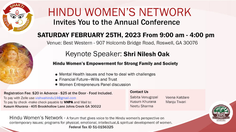 'Hindu Women's Network' an initiative of the Vishwa Hindu Parishad Atlanta, reconvened for their annual Hindu Women's Conference on February 25 th , 2023, from 9:00 am to 4:00 pm courtesy of the Best Western at 907 Holcomb Bridge Road, Roswell.